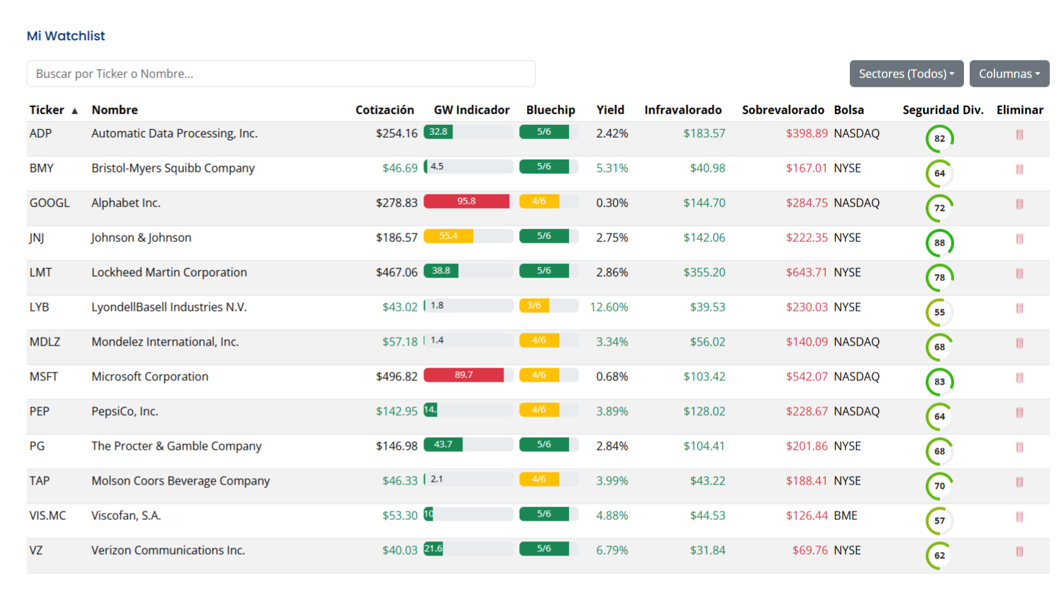 Guarda las empresas que te interesan en tu watchlist personal para un acceso rápido y seguimiento continuo de sus métricas clave y valoración.