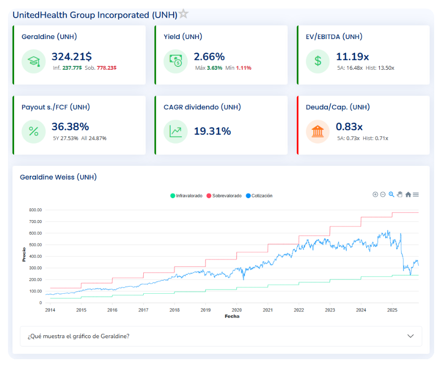 Más allá de Weiss, obtén gráficos detallados de dividendos, valoración, deuda, BPA y sostenibilidad.